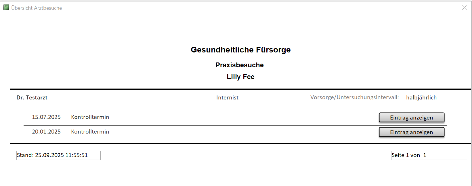 Unter dem Punkt Gesundheitliche Vorsorge werden dann die dokumentierten Kontakte für das gewählte Jahr angezeigt bzw. gedruckt
