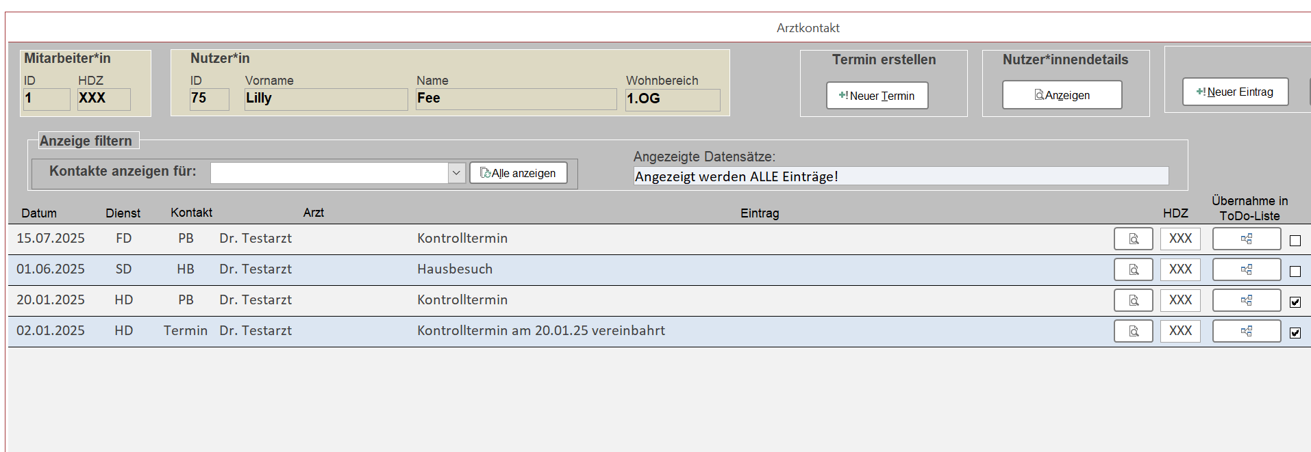 Jeder Kontrolltermin wird dann unter den Arztkontakten dokumentiert